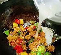 放入鱿鱼卷,加入生抽、料酒、醋,快速翻炒几下,时间不要久