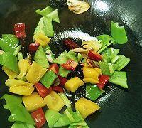 下入尖椒,青红椒炒至断生