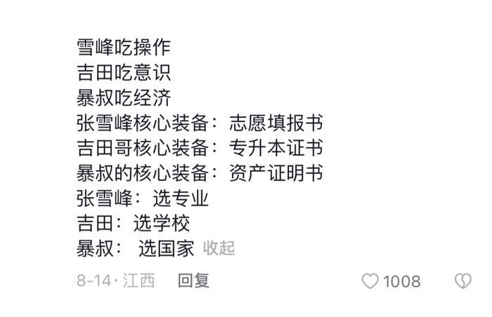 这三位分别是指导高考志愿的张雪峰,指导大专报考的吉田,以及指导出国留学的暴叔。