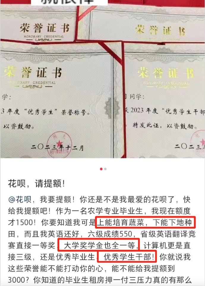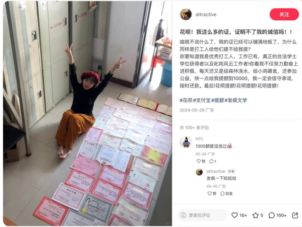 于是,他们通过晒证书的方式,希望用他们获得的能力提升自己的花呗额度,并保证自己理性消费,会按时还款,甚至还会多做公益。