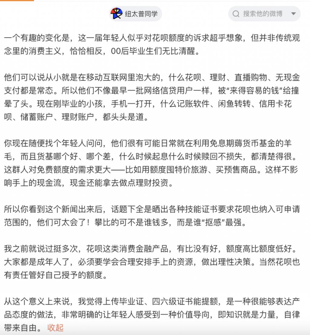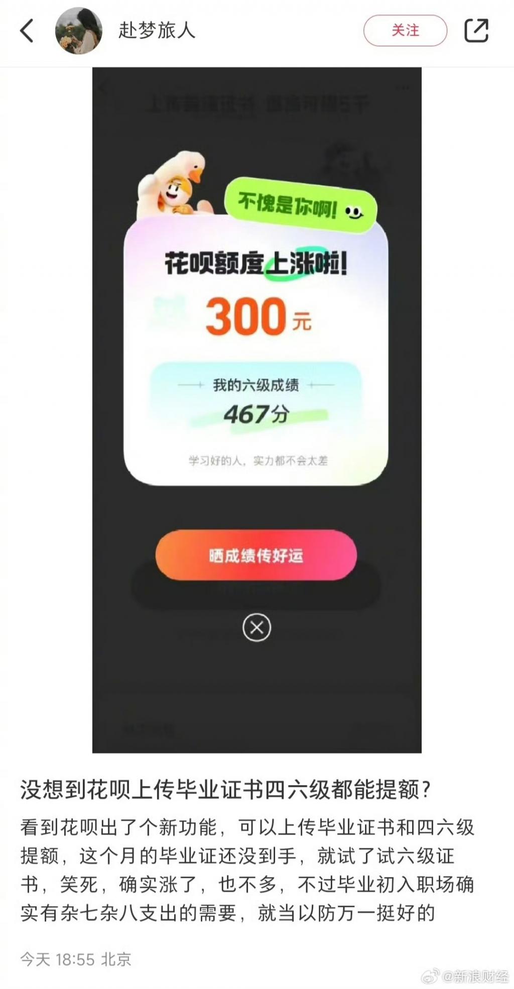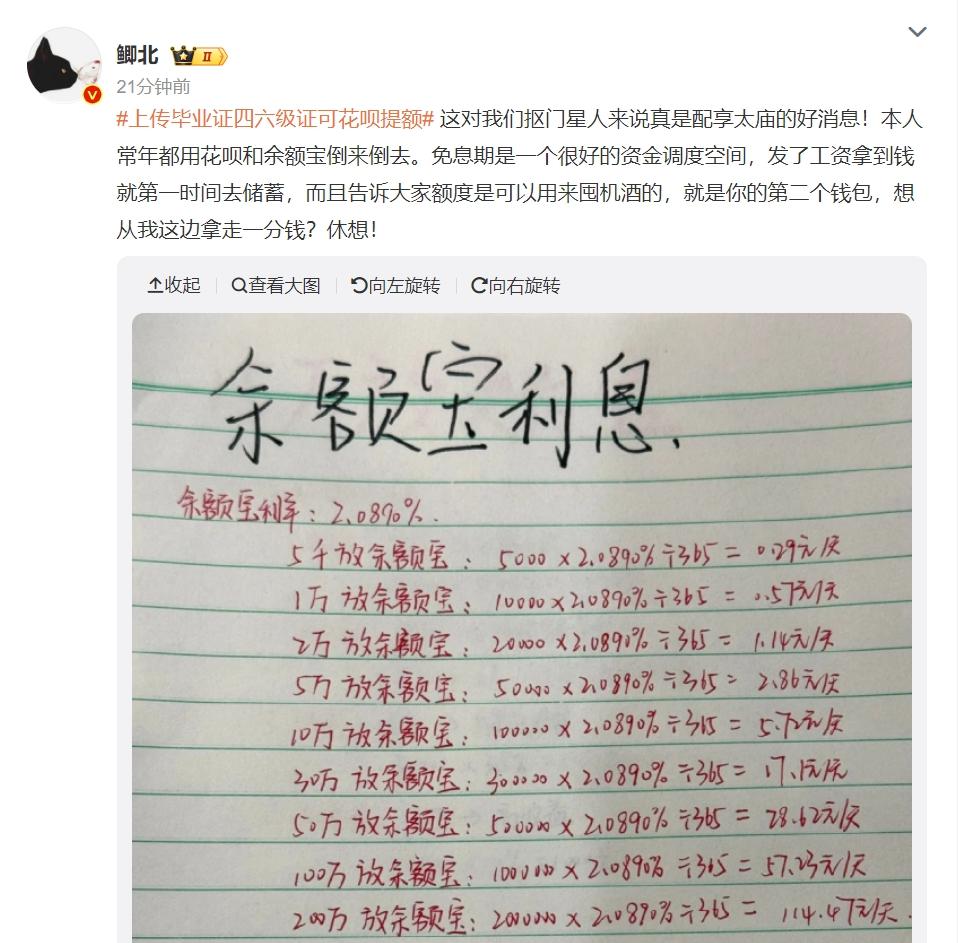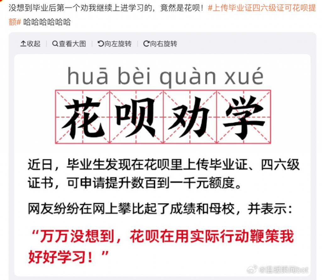 今天,微博上出现一个破千万的话题 # 上传毕业证四六级征可花呗提额 #。