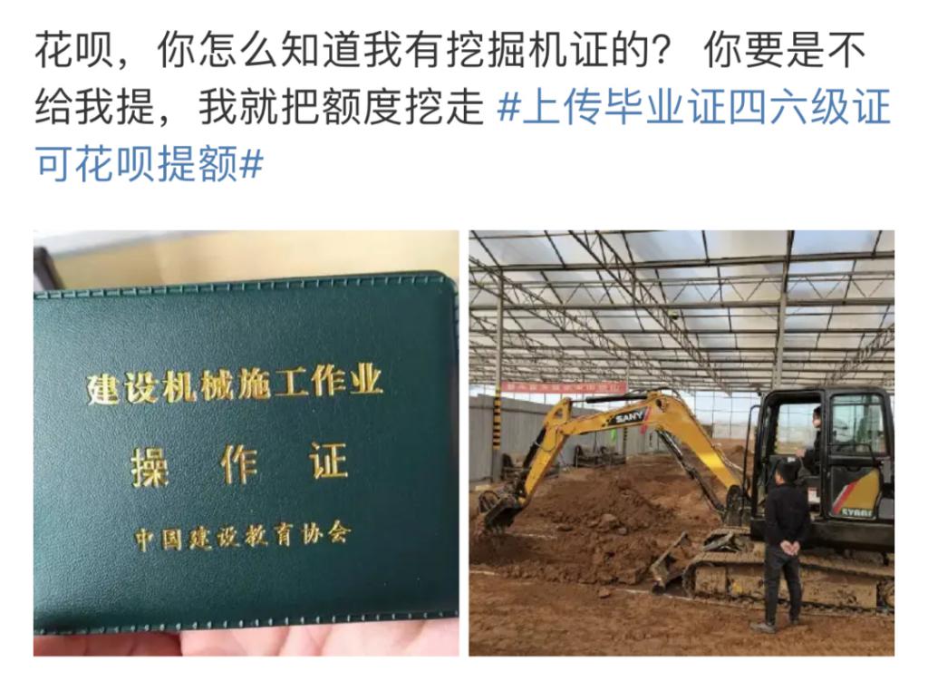 不服气的职场老鸟,纷纷晒出五花八门的证书——注册会计师、挖掘机操作证、马拉松二级选手认证 …… 甚至表示:额度涨不涨不要紧,就想花呗看看我的实力。