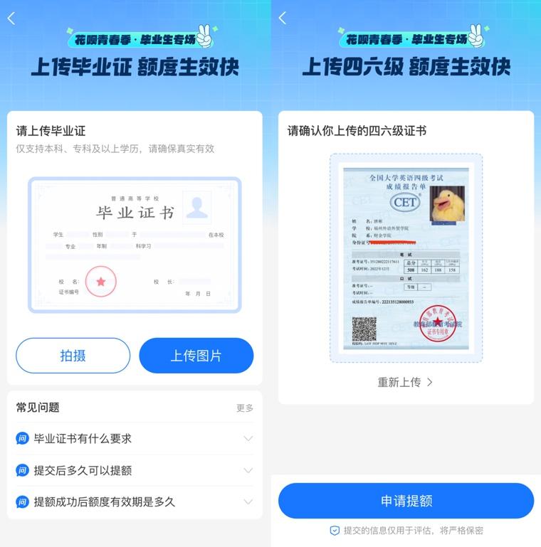 上传毕业证、四六级证书,花呗可提额