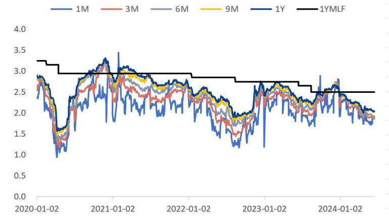 从上周二级市场表现来看,据华福固收团队统计,1M 存单上行 2bp 至 1.88%,3M、6M 存单分别下行 1bp、3bp,9M、1Y 存单持续横盘。1Y 存单在 2.04% 左右,与 1YMLF 利差在 -46bp 左右 , 处于历史较低水平。不过与 MLF 相比,当前存单对银行的吸引力仍较高。