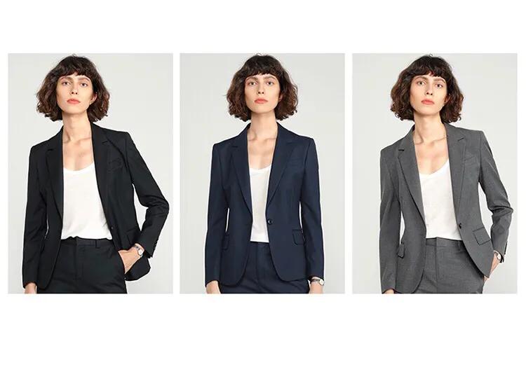 正确的做法如下,我们一般常见的女士正装多以黑色西装外套+黑色西装裤+白色衬衣为主,这是正式场合的标配。而且正装不宜过于宽松肥大,也不建议修身+贴身,得体合身就可以了。以下是几种常见的正装示范。