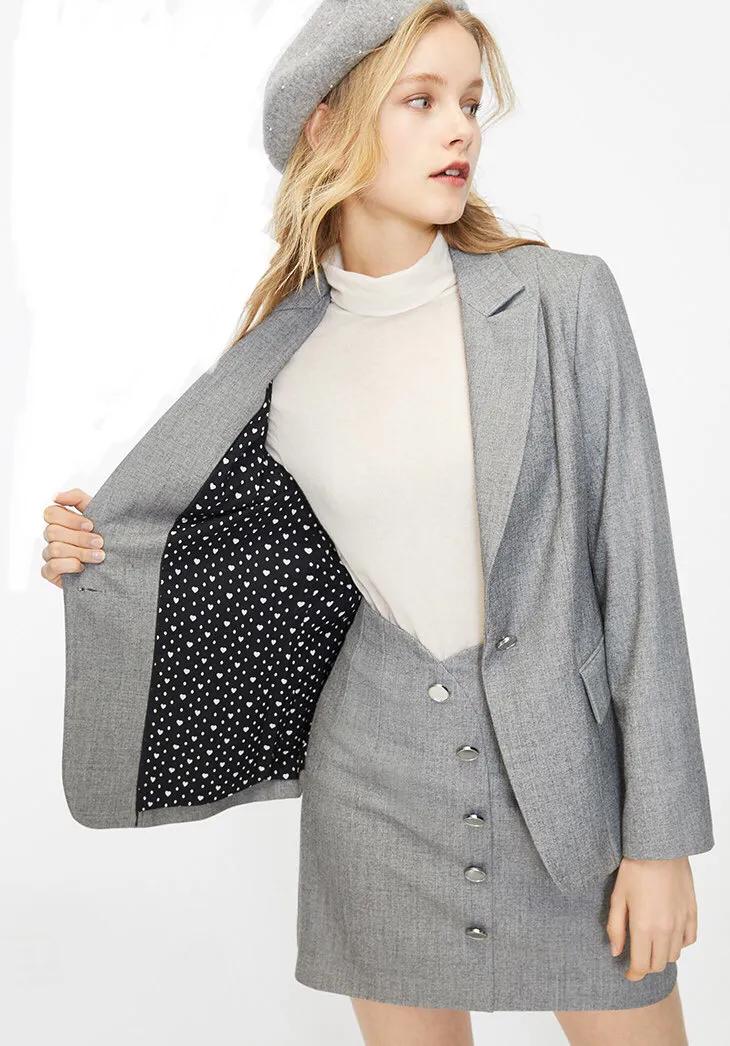 这套正装,很难穿出精致感和时髦感,总觉得太过于板正,穿出来有些像是卖保险或者售楼部的工作人员,所以为了避免出现这种问题,可以在衣服的细节处做一些处理。