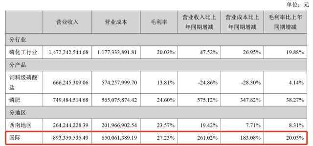 值得一提的是,年报显示,2020年,川金诺国际营业收入为2.48亿元,占总营收的23.57%。2021年,这一营收额为8.93亿元,占总营收的58.17%,同比增长261.02%。