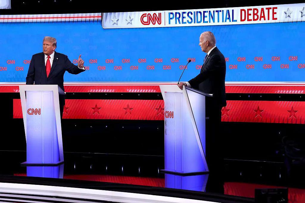 当地时间 6 月 27 日,美国现任总统拜登和前总统特朗普进行 2024 年美国总统大选首轮辩论(视觉中国)