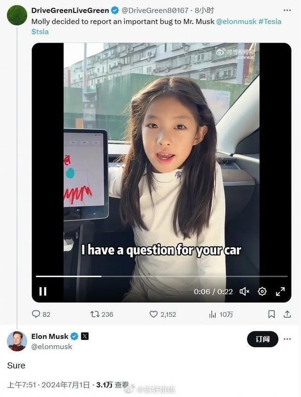 她自己花了一分钟时间组织了语言,我们帮她拍完后,发在了我的微博上,而后被在国外的热心网友看到并转发在 x 上,马斯克看到并回复了。我告诉茉莉马斯克回复了你的视频,她说好开心啊,然后继续玩去了。