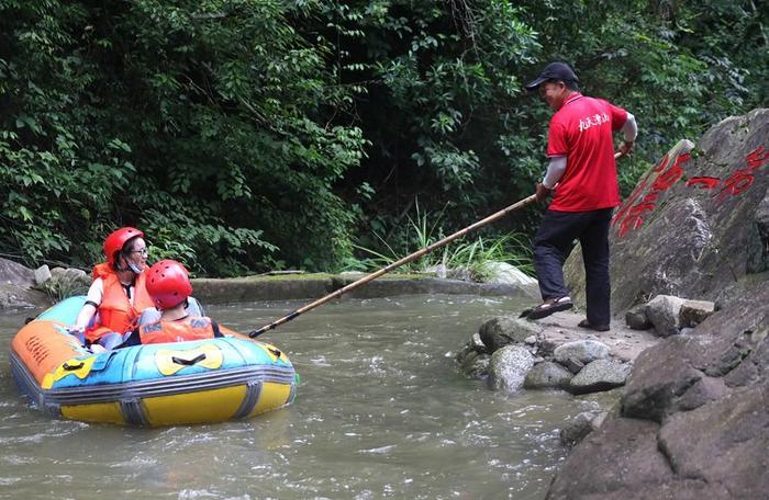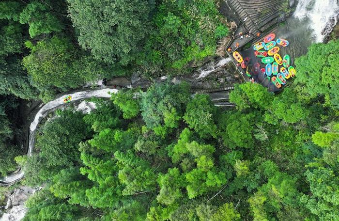 近日,江西省宜春市宜丰县黄垦镇九天国家4A级旅游景区,游客在峡谷漂流区与“浪”共舞,乐享清凉。近年来,宜丰县充分发挥良好的生态环境和丰富的山水资源优势,不断推进农旅融合发展,将美丽资源变为“美丽经济”,助力乡村振兴。(何贱来)