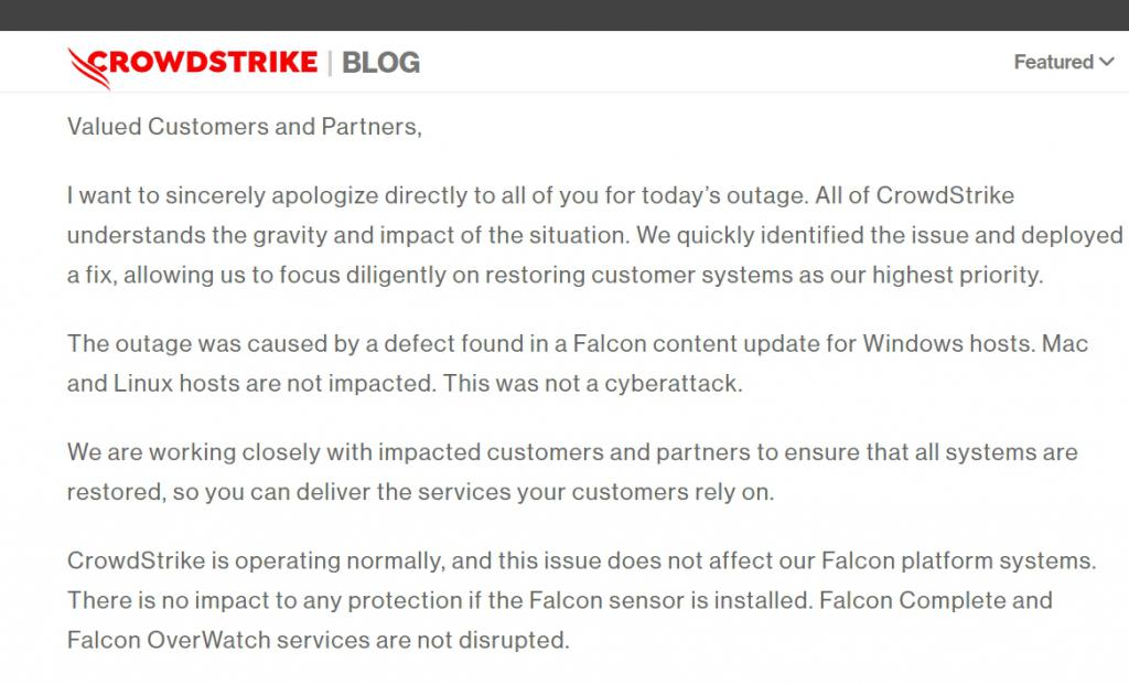 微软也在博客中表示 :" 我们目前估计,CrowdStrike 的更新影响了 850 万台 Windows 设备,不到所有 Windows 设备的 1%…… 虽然百分比很小,但广泛的经济和社会影响反映出,运营许多关键服务的企业都在使用 CrowdStrike。"