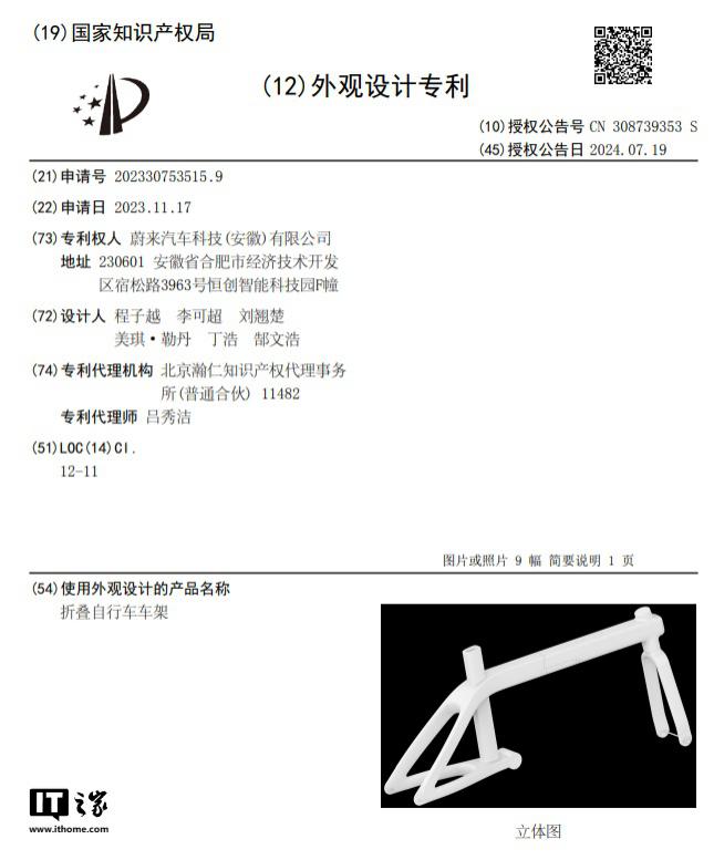 IT 之家注意到,蔚来现有一份关于折叠自行车车架的专利获公开,申请人为蔚来汽车科技(安徽)有限公司,其中包括蔚来折叠自行车可能的外观设计。