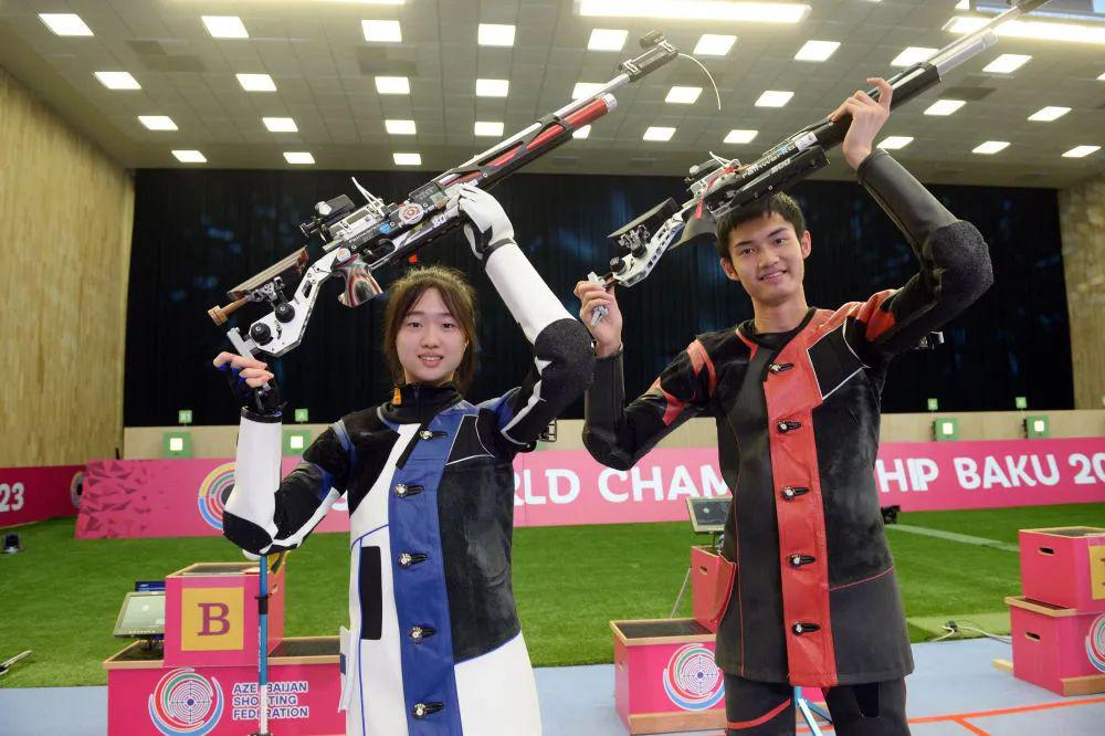 2023 年 8 月 18 日,黄雨婷 / 盛李豪获 2023 年射击世锦赛 10 米气步枪混合团体冠军。新华社发(巴巴耶夫摄)