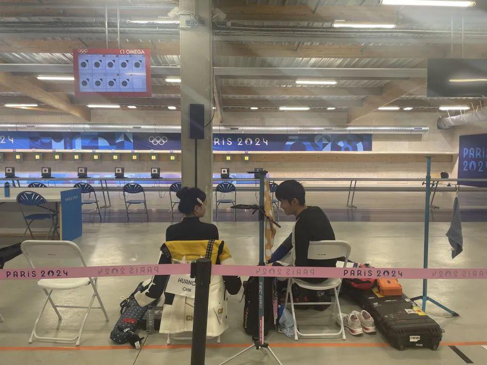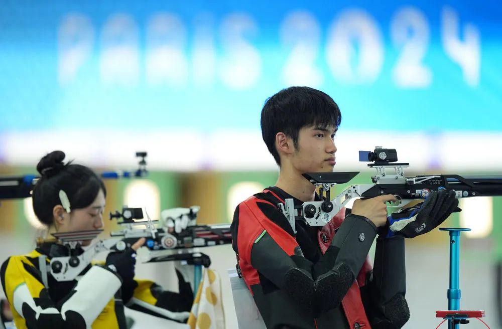 7 月 27 日,中国选手黄雨婷 / 盛李豪(右)巴黎奥运会射击 10 米气步枪混合团体决赛中。新华社记者 鞠焕宗 摄