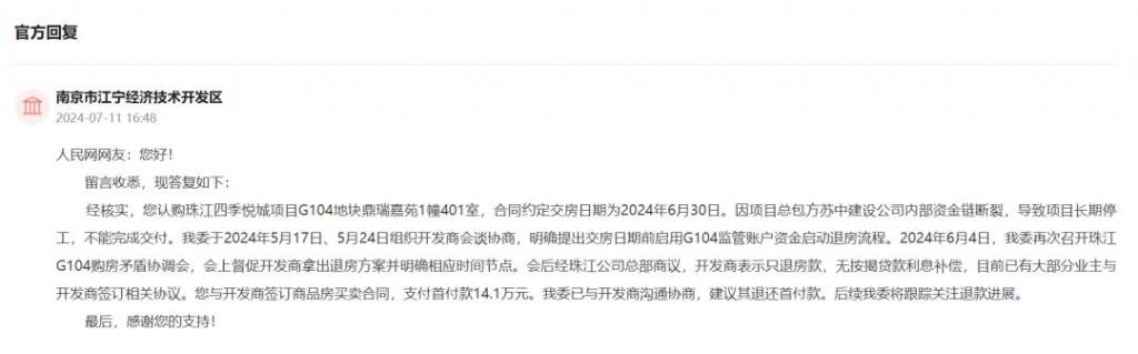 7 月 11 日,南京市江宁经济技术开发区回复该网友称:经核实,您认购珠江四季悦城项目 G104 地块鼎瑞嘉苑 1 幢 401 室,合同约定交房日期为 2024 年 6 月 30 日。因项目总包方苏中建设公司内部资金链断裂,导致项目长期停工,不能完成交付。我委于 2024 年 5 月 17 日、5 月 24 日组织开发商会谈协商,明确提出交房日期前启用 G104 监管账户资金启动退房流程。2024 年 6 月 4 日,我委再次召开珠江 G104 购房矛盾协调会,会上督促开发商拿出退房方案并明确相应时间节点。会后经珠江公司总部商议,开发商表示只退房款,无按揭贷款利息补偿,目前已有大部分业主与开发商签订相关协议。您与开发商签订商品房买卖合同,支付首付款 14.1 万元。我委已与开发商沟通协商,建议其退还首付款。