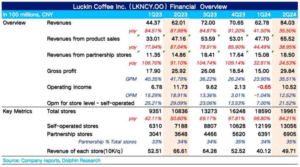 具体来看,今年二季度,瑞幸实现总收入 84.03 亿元人民币,同比增长 35.5%,环比增长 34%。其中,自营门店收入为 62.77 亿元,较去同期的 44.95 亿元增长 39.6%;联营门店收入为 18.5 亿元,较去年同期的 14.86 亿元增长 24.5%。