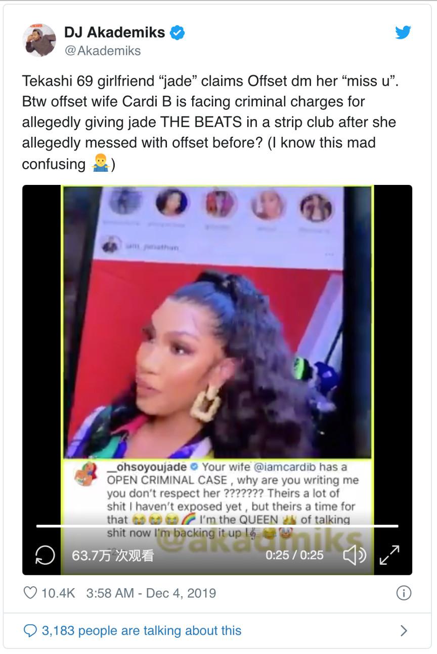 没过多久,Offset 再次被传勾搭前绯闻小三、说唱歌手 Tekashi6ix9ine 的女友 Jade,结果卡姐第一时间出来维护丈夫:他被盗号了↓