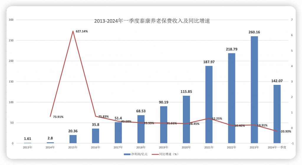 据财联社记者梳理,2013 — 2023 年,泰康养老保费收入从 1.16 亿元快速攀升至 260.16 亿元。整体来看,过去 10 年,泰康养老保费收入保持稳健增长。
