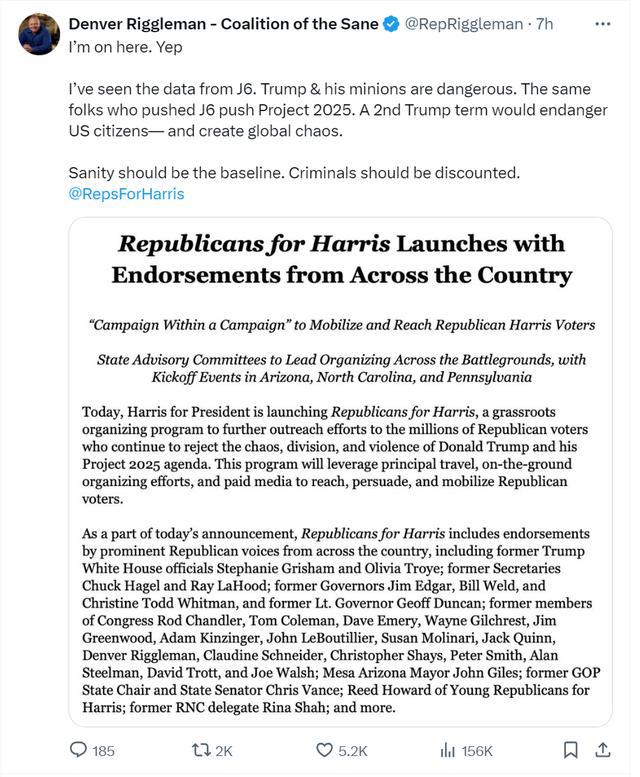 此前,哈里斯竞选团队发起了 " 共和党支持哈里斯 "(Republicans for Harris)倡议,而里格尔曼就加入了其中。