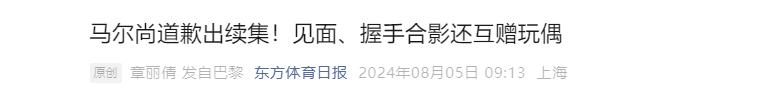 不过为了表达正式的歉意,8 月 4 日赛后,马尔尚再度上门,这回他和朱志根教练见面了。马尔尚面对面地做了解释,双方还互赠了礼物,马尔尚送给朱教练的是巴黎奥运会吉祥物毛绒玩偶,朱教练回礼的则是一只熊猫玩偶。