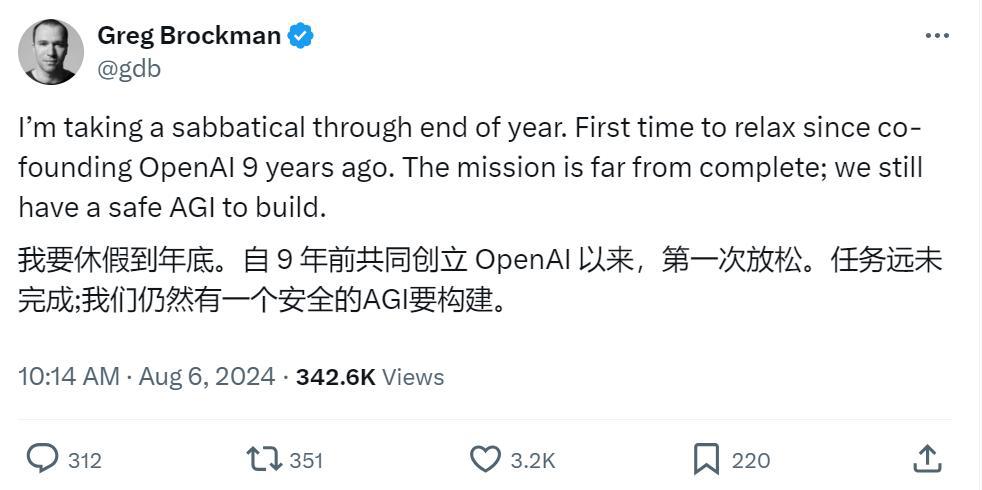 雪上加霜的是,今天上午 Greg Brockman 本人发推说,自己正在长期休假。这是他加入 OpenAI 九年以来第一次休假,计划休假至年底。