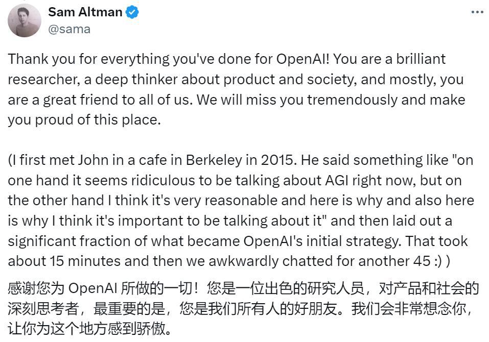 奥特曼则对 Schulman 的告别表示官方感谢,并回忆了两人在 2015 年伯克利初见面时,谈论 OpenAI 最初战略的场景。