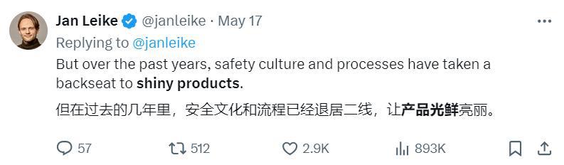 典型代表就是 Jan Leike。他在离职后就指出,他更关注安全性、一致性等问题,但 OpenAI 的安全文化和流程已经让位于产品。