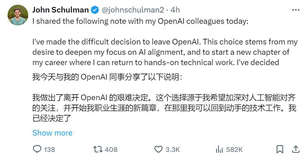 从去年 11 月 OpenAI 董事会换血、Sam Altman 被解雇后又重聘,今年超级对齐团队解散、OpenAI 联合创始人 Ilya Sutskever 离职,到现在 John Schulman 的离职。OpenAI 的一直动荡不安。