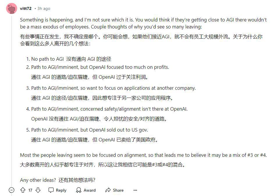 此外,大多数离开的人员是研究对齐,让人不禁为 OpenAI 的对齐和安全捏把汗。
