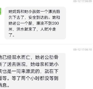 在该视频评论区,有网友反映自己的侄女在此事中溺亡。潇湘晨报记者联系到该网友,她称,当时侄女一家人前往漂流,侄女的船在漂流中突遇洪水被冲走,12 日下午,家属在殡仪馆见到侄女遗体。