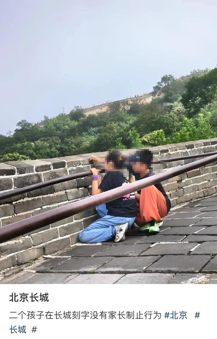 8 月 3 日,有网友在社交平台上发布一张图片,有两个孩子在长城上刻字,没有家长制止该行为。此事引发关注。