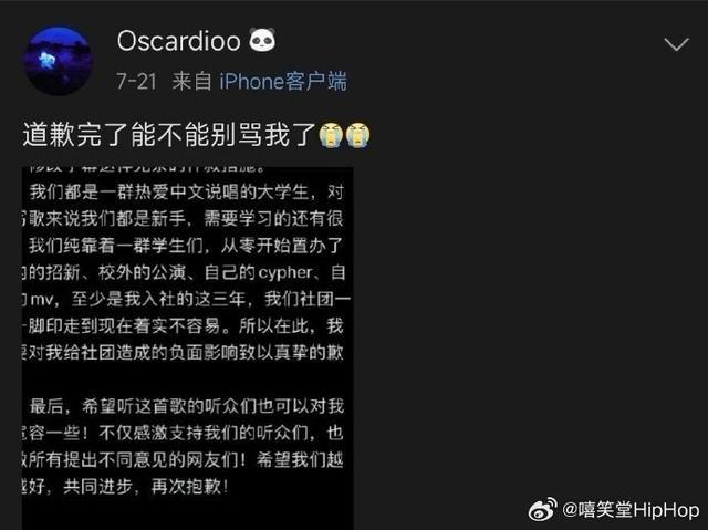 目前,当事 Rapper 也表示道歉,该同学称:只是为了更酷更帅更押韵。