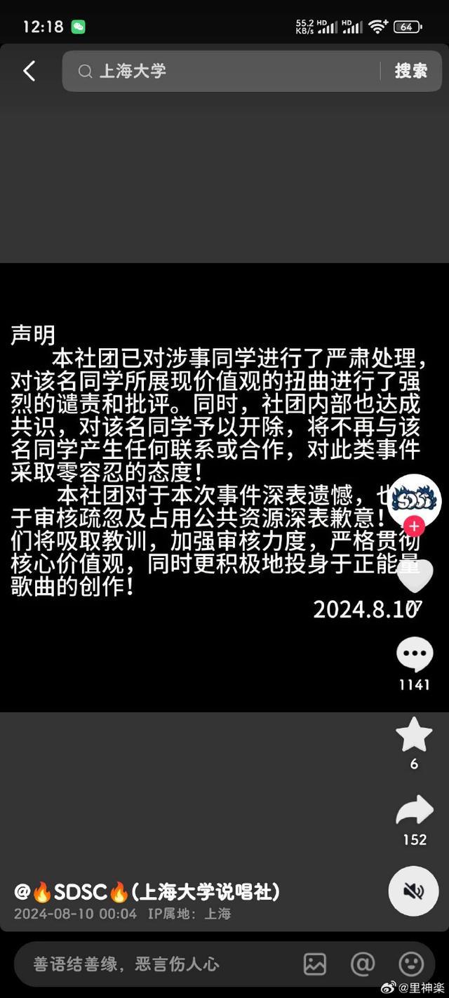 8 月 10 日,上海大学说唱社官方账号发布了声明:已对涉事同学进行了严肃处理,对该名同学所展现价值观的扭曲进行了强烈的谴责和批评。同时,社团内部也达成共识,对该名学生予以开除。将不再与该名学生产生任何联系或合作,对此类事件采取零容忍的态度。