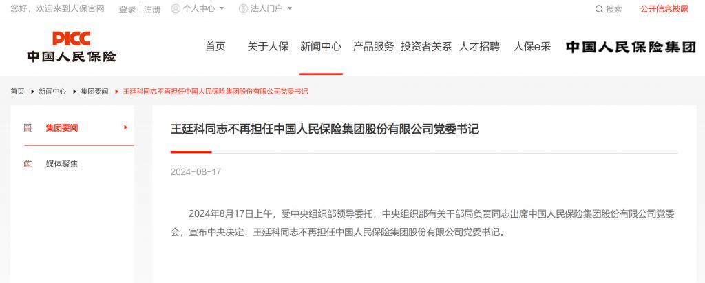 2024 年 8 月 17 日上午,受中央组织部领导委托,中央组织部有关干部局负责同志出席中国人民保险集团股份有限公司党委会,宣布中央决定:王廷科同志不再担任中国人民保险集团股份有限公司党委书记。