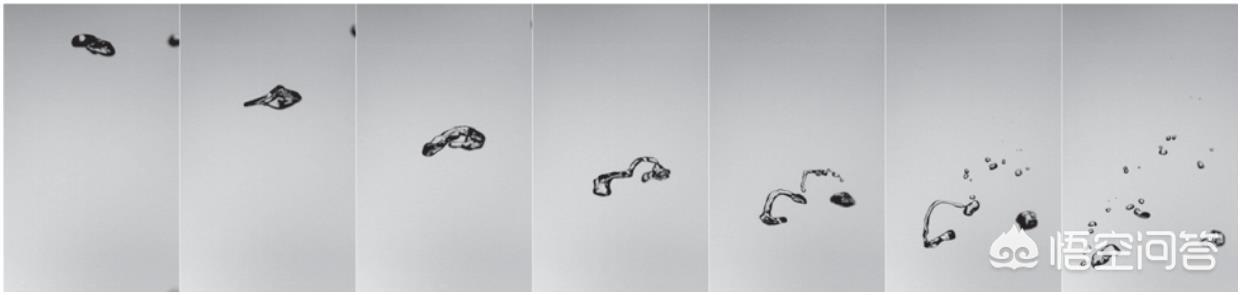 当然,并不是所有的大雨滴都会以同样的方式分解成小雨滴,有些水滴会跳过“降落伞”的阶段而直接破碎。下图同样是一个直径6毫米水滴的下落分解过程: