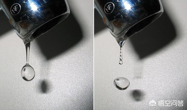 当水滴从水龙头滴落时,受内聚力的影响,水滴与其上方的水之间出现“藕断丝连”的情况,直到内聚力无法克服重力,水滴发生断裂而掉落。从下面这两张照片中我们可以看得更清楚。