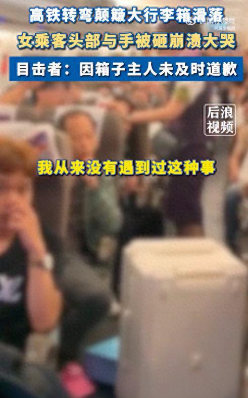 此前,拍摄者称,当时列车开出几分钟,因转弯颠簸,行李箱因为没放好滑落下来,砸中该女子的头部与手。