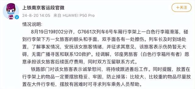 8 月 19 日,浙江杭州有网友发视频称,在高铁 G7661 次列车上,行李架上的行李箱滑落,女乘客头部被砸中情绪崩溃大哭。20 日,上铁南京客运段官微发布情况说明称,该旅客表示伤势暂无大碍,邻座男旅客(白色行李箱所有者)愿意承担该女旅客后续医疗费用。
