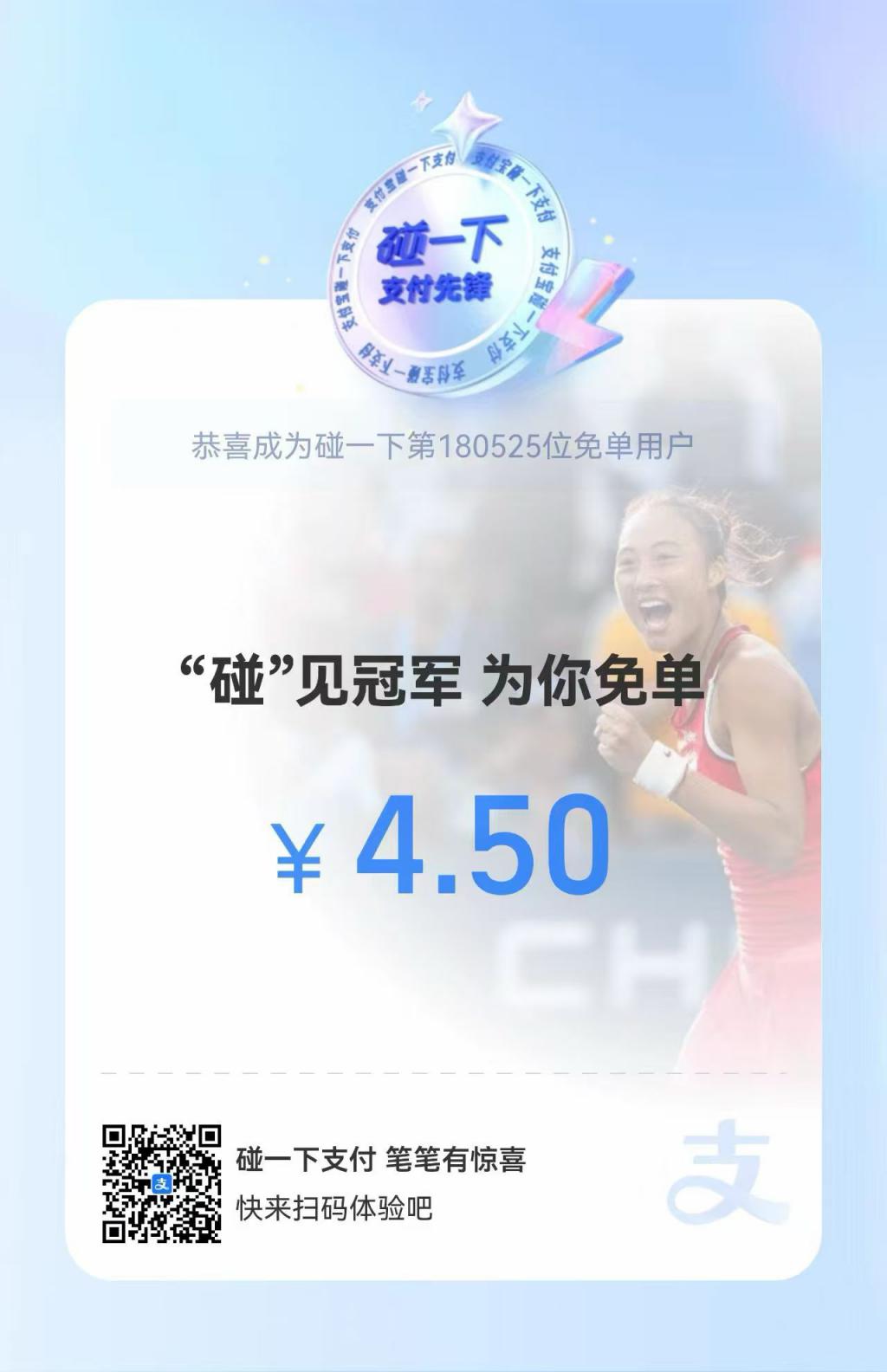 随着郑钦文夺得奥运冠军,支付宝作为郑钦文的主赞助商之一,推出的随机免单活动更是带动一波线下 " 碰一下 " 热潮。8 月 5 日,支付宝发放的 6 万份碰一下随机免单很快就被一抢而空。8 月 6 日,免单活动继续加码,加送的 16 万份免单再次引发抢单风潮。