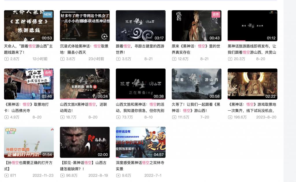 随着《黑神话》上线的脚步愈发临近,山西文旅的宣传节奏也明显加快。今年以来,山西文旅厅的 B 站官方账号发布了 8 条有关《黑神话》的视频,内容涵盖联动活动介绍和旅游路线预热等。