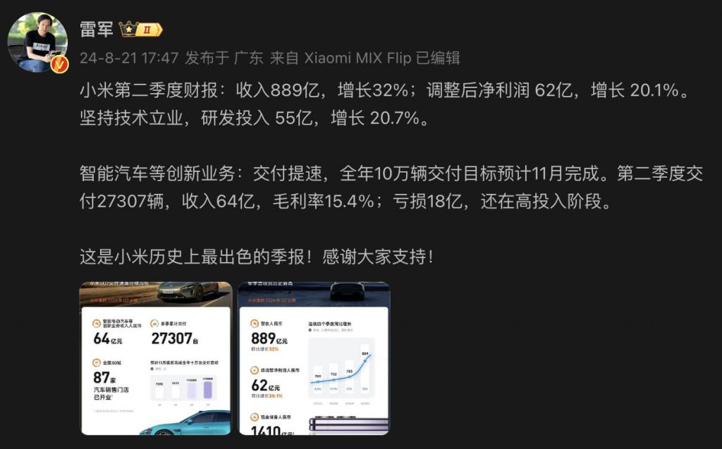 8 月 21 日,小米集团发布 2024 年第二季度财报。本季度,集团总营收达到 888.9 亿元,同比增长 32%,创历史新高;调整后净利润 62 亿,增长 20.1%;集团整体毛利率达到 20.7%;现金储备为 1410 亿元。