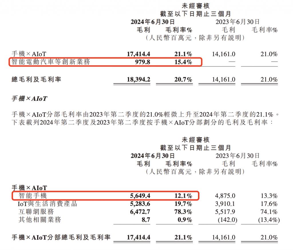 而随着财报发布,最大的惊喜来自于汽车业务毛利率的披露。在上市交付的第一个季度里,小米汽车业务的毛利率就达到了 15.4%。