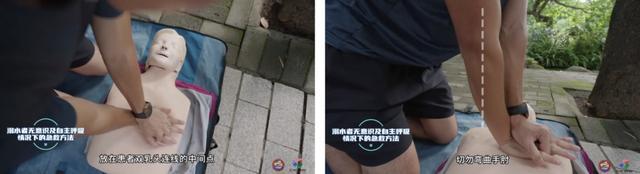 人工呼吸后接胸外按压,救助者将一只手的手掌根放在患者双乳头连线的中点,手臂要伸直,切勿弯曲手肘。