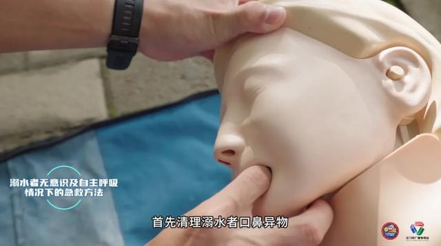 在溺水者无意识和自主呼吸的情况下,首先先清理溺水者口鼻异物,用仰头抬颌法打开气道,对溺水者进行人工呼吸。