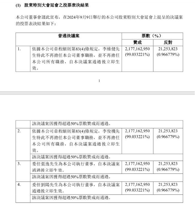 根据公告,4 项决议案均获逾 99% 赞成票通过,即李维健被罢免董事及主席、行政总裁等职务,李俊机不再担任公司执行董事及副总裁,张逸和刘阳成功入局任执行董事即时生效。此外,张逸获委任为董事会主席、公司授权代表等,潘声海自 2024 年 9 月 10 日起由非执行董事调任为执行董事,并待香港入境事务处向其发出工作许可签证后将获委任为公司行政总裁。