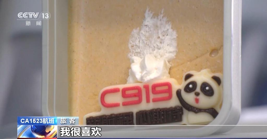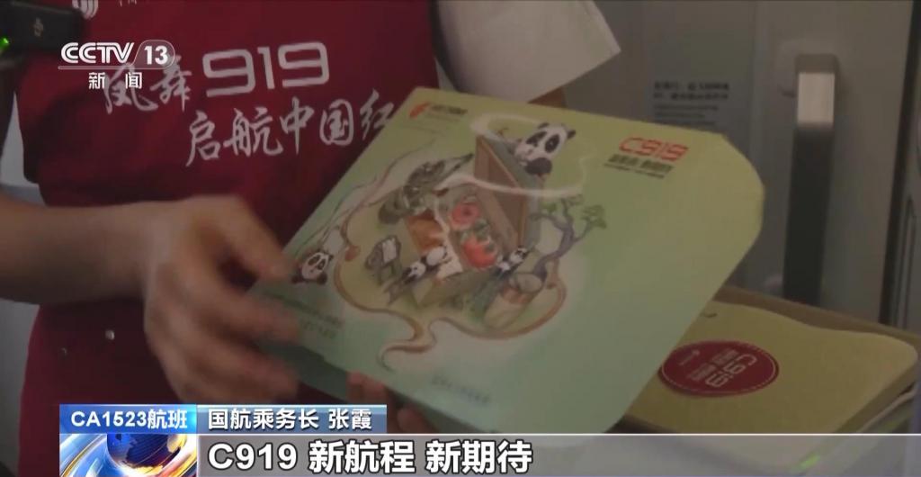 国航乘务长 张霞:针对 919 机型,我们在餐食上是有一些特殊的标识,C919 新航程,新期待,同时在餐盒内侧有特殊标识,餐食里面的蛋糕,也有 C919 的特殊标识。