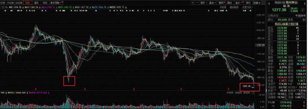 财联社 9 月 18 日讯(编辑,周颖),今日 A 股市场白酒股再度集体下跌,截至午间收盘,岩石股份跌停,贵州茅台跌 2.06%,股价报收 1277.3 元 / 股。此外,金徽酒、伊力特、天佑德酒等均跌超 2%。值得注意的是,按不复权,贵州茅台早盘一度跌至 1268.89 元,跌破 2022 年 10 月 31 日前低 1333 点。
