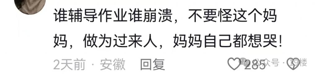 有人则晒出自己的经历,表示对妈妈感同身受," 谁辅导作业谁崩溃 "。