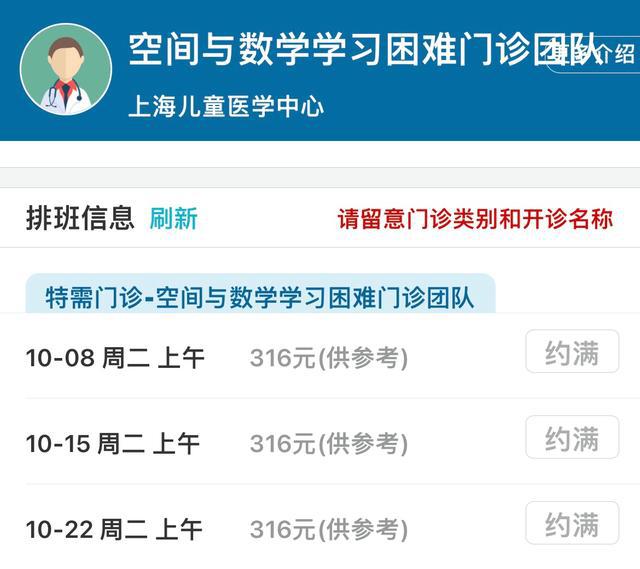记者检索发现,10 月 8 日、10 月 15 日、10 月 22 日三天上午空间与数学学习困难门诊的号源已经全部约满,挂号费 316 元。
