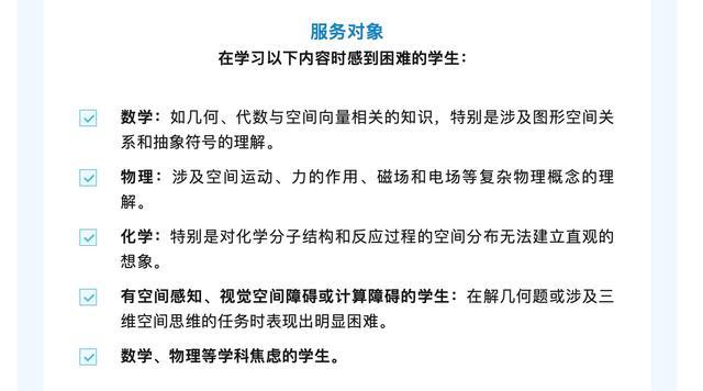 由于空间感知和想象能力的缺失,孩子在学习过程中,特别是在数学、物理、化学等需要空间思维的学科上,往往表现不佳。